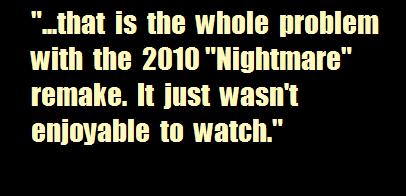 Along with that unsettling aspect, there were other things that failed to make it a good film. Because they didn’t make Freddy a murderer (when he was alive), the whole “parents-cornering him-and-burning-him” was slightly askew. I understand that the parents were horrified and angry but it really didn’t make sense. If he were a murderer, you would see that the extreme punishment was appropriate and justified. But in this case, it almost makes Freddy look like a victim. I know that they were trying to force him out of hiding, with the fire, but there is no mention of the legal system failing, etc. that was part of the original. This is an example of one of the many “gaps” in the movie which disturbed the overall flow of it.